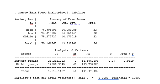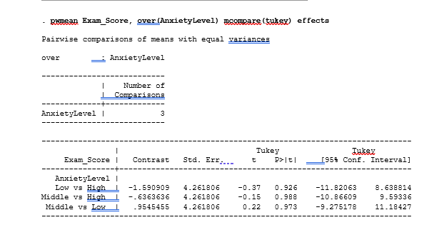 STATA will then output the results, showing whether there are significant differences in exam scores based on anxiety levels. If the p-value is less than 0.05, you conclude that at least one group’s mean score is significantly different from the others. Post-hoc tests can identify which specific groups differ from each other.